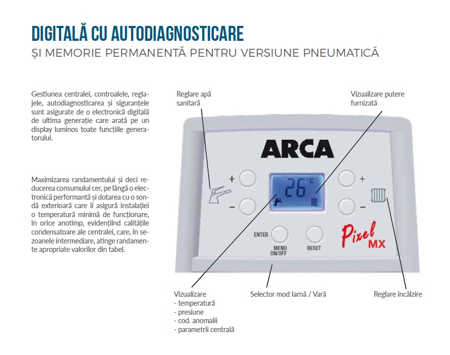 Pixel MX PN este noua centrală cu condensare cu preamestec miniaturizată cu tehnologie electronică digitală ARCA. Un proiect articulat bazat pe o tehnologie inovativă extrem de afidabilă care utilizeaza un schimbător din oțel inox monotub pentru a oferi utilizatorului maximum de confort și economisire energetica. Modele: de la 20 la 35 kW. Modularea flăcării optimale limitate la 1:7 pentru a garanta cea mai mare silențiozitate oferită de un ventilator cu turații variabile, folosit cu viteză redusă și cu range-ul cel mai performant. Particularitățile camerei etanșe apără centrala de posibile aspirări de impuritați, de apă sau de insecte foarte periculoase pentru ventilator și pentru vana de gaz.