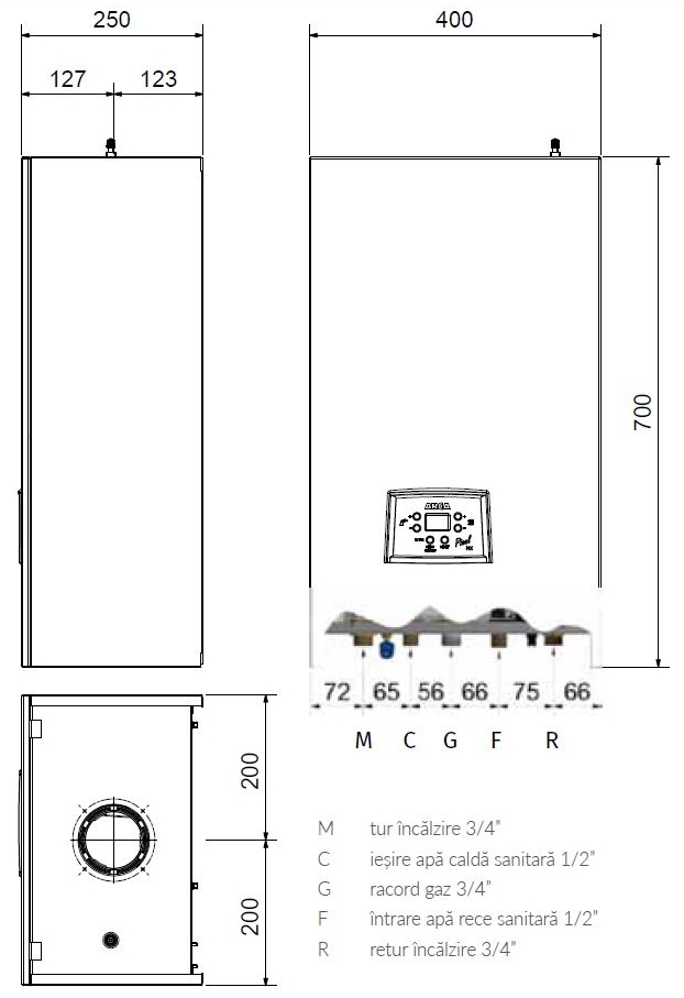 DIMENSIUNI REDUSE - Arhitectură centralei este rezultatul unui studiu aprofundat al funcțiilor și al spațiilor care permit o plasare rațională ale componentelor pentru satisfacerea exigențelor de accesibilitate în timpul întreținerii programate periodice. Rezultă cea mai mică centrala cu condensare de pe piață cu dimensiuni de 700 x 400 x 250 mm. Alegerea folosirii camerei etanșe în loc de furtunul de conectare dintre ventilator și aspirare, garantează o silențiozitate mărită și previne posibilitatea apariției apei (datorită condensului sau ploii) sau insectelor din vana de gaz.