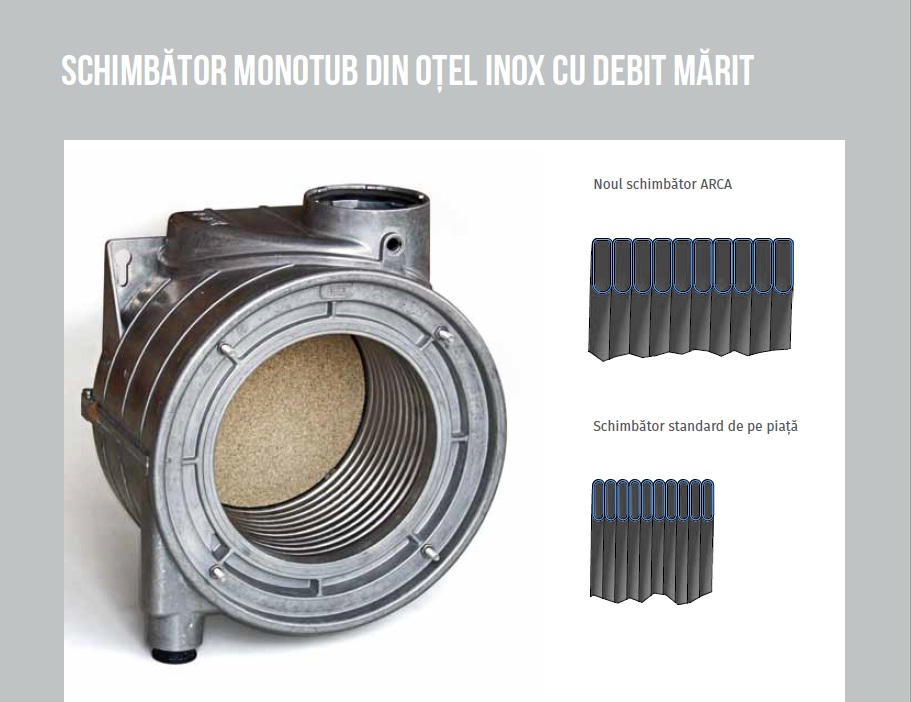 Schimbătorul monotub cu debit mărit și cu pierderi de sarcină scăzute, constituie o evoluție importantă pentru sectorul centralelor cu condensare, față de vechile modele ale schimbătorilor cu fluxuri paralele, încă prezenți pe piață. Cu aceasta soluție tehnologică, centrala rezultă mult mai rezistentă în prezența unor instalații necurațate complet de reziduri organice sau neorganice. O tehnologie care pentru afidabilitatea sa se aproprie de cea a centralei cu dublu schimbător, în conformitate cu rigurozitatea bazei științifice care utilizează materiale nobile precum oțel inox pentru a desfășura diferite funcții în special cea de condensare directă.